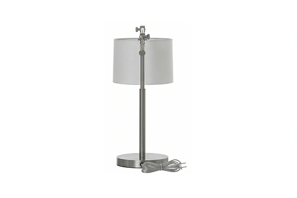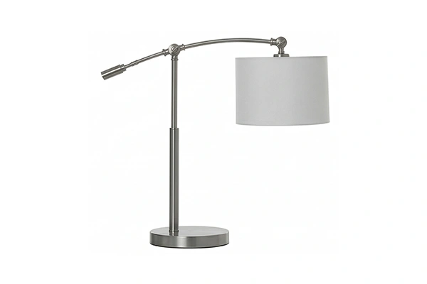 The adjustable arc arm on this lamp can be repositioned to move the cylindrical shade to the exact position over the desk where the guest needs the light - that adjustability is the functional detail that separates a true task lamp from an arc lamp with a fixed arm, and for a hotel guestroom desk where different guests use the surface for different tasks at different positions, the ability to reposition the shade without moving the base is directly useful. The Adjustable Arm Task Desk Lamp uses a cylindrical open-bottom shade at the arm end that focuses the light output in a defined cone downward over the work surface rather than diffusing it in all directions, and the weighted disc base holds the arm extension stable at any position the arm is set to. The matte brushed nickel finish runs consistent across the base, arm, and shade cylinder.
