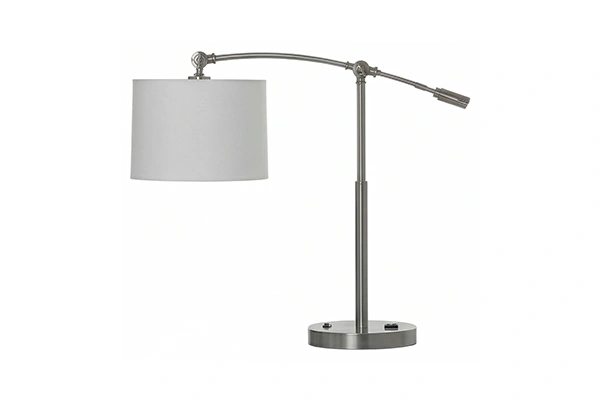 Fitting well into hotel guestroom writing desks, boutique hospitality suite task surfaces, and business-class room work areas where an adjustable arc task lamp delivers directed, repositionable light over the work surface, the Adjustable Arm Task Desk Lamp provides a guestroom desk lamp that puts controlled light where a working guest needs it and can be repositioned without moving the base when the task or position at the desk changes. The matte brushed nickel arm and disc base hold their quality through years of commercial hotel room use and the cylindrical shade keeps the light output focused over the work area rather than spreading ambient light across the room. For hotel properties that want their guestroom desk lamp to deliver a genuine, adjustable task light quality at the writing surface, this lamp is built for exactly that.
