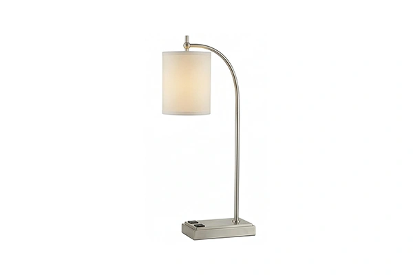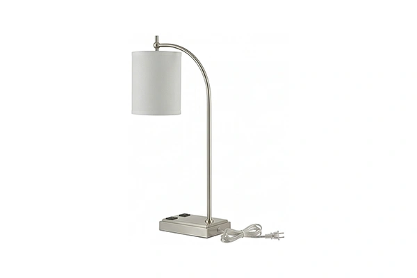 The curved arc arm on this lamp extends forward from the weighted base and brings the shade to rest above and in front of the work surface rather than centered over the base column - that forward arc positions the light source over the area on the desk where the guest is actually working, which a straight-post lamp centered on the desk edge cannot replicate without moving the base into the work zone. The Curved Arm Hanging Shade Desk Lamp uses that arc arm to keep the weighted disc base behind the active work area while the hanging drum shade at the arc end delivers the light precisely where it is needed at the desk surface. The brushed nickel finish runs consistent across the base, arm, and shade hardware and the arc positions the shade at a comfortable task light height without requiring adjustment.