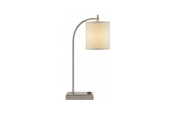 Working well in hotel guestroom writing desks, boutique hospitality suite work surfaces, and business-class room desk positions where a curved arm lamp keeps the shade positioned over the active task area, the Curved Arm Hanging Shade Desk Lamp provides a desk lamp that puts light where a guest working at the surface needs it rather than where the lamp base happens to sit. The brushed nickel arc arm and disc base hold their quality through years of commercial hotel room use and the forward arc keeps the shade in the correct position over the work surface without the base occupying the desk area below it. For hotel properties that want their guestroom desk lamp to deliver a genuine task light quality over the writing surface, this lamp is built for that.